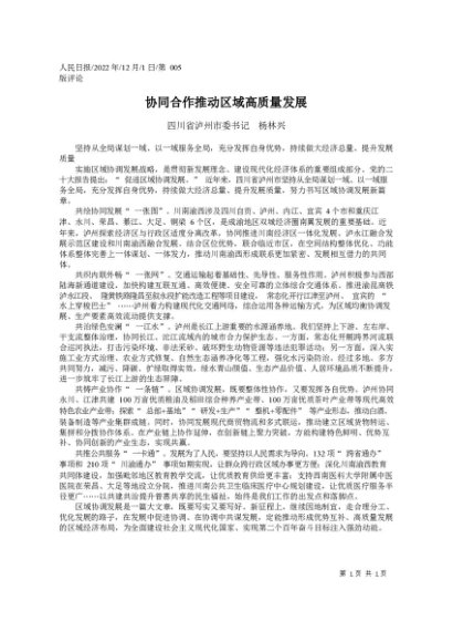 署名文章:2022.12.01四川省泸州市委书记杨林兴:协同合作推动区域高质量发展