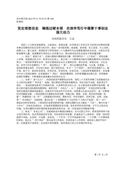 / 署名文章:2022.11.29市政府副市长王金:坚定理想信念锤炼过硬本领在深学笃行中凝聚干事创业强大动力