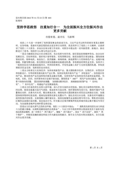 / 署名文章:2022.11.22市委常委、副市长马新辉:坚持学思践悟注重知行合一为全面振兴全方位振兴作出更多贡献