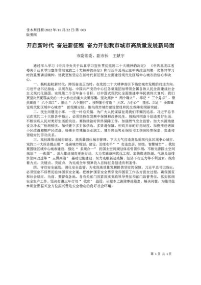 署名文章:2022.11.22市委常委、副市长王献宇:开启新时代奋进新征程奋力开创我市城市高质量发展新局面