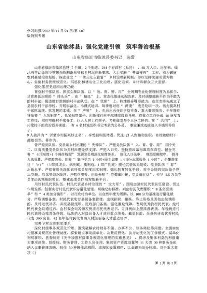 署名文章:2022.11.21山东省临沂市临沭县委书记张雷:山东省临沭县:强化党建引领筑牢善治根基