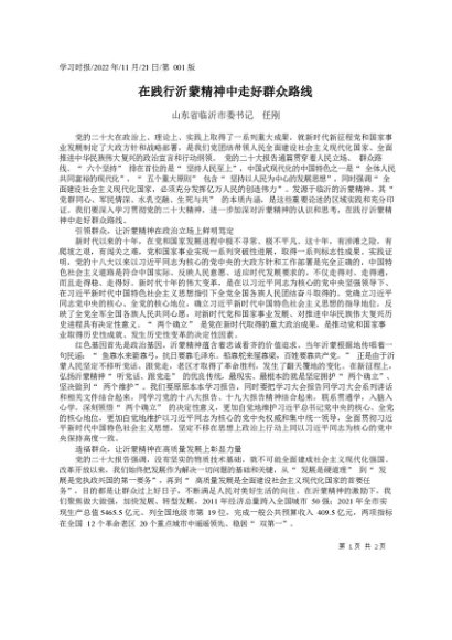 / 署名文章:2022.11.21山东省临沂市委书记任刚:在践行沂蒙精神中走好群众路线
