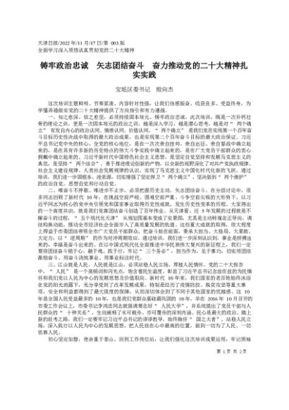 署名文章:2022.11.17宝坻区委书记殷向杰:铸牢政治忠诚矢志团结奋斗奋力推动党的二十大精神扎实实践