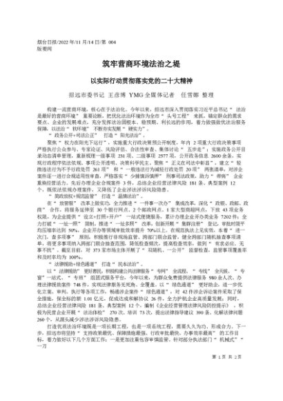 / 署名文章:2022.11.14招远市委书记王彦博YMG全媒体记者任雪娜:筑牢营商环境法治之堤