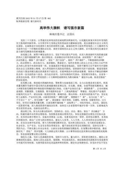 署名文章:2022.11.17麻城市委书记汪国兵:高举伟大旗帜谱写强市新篇