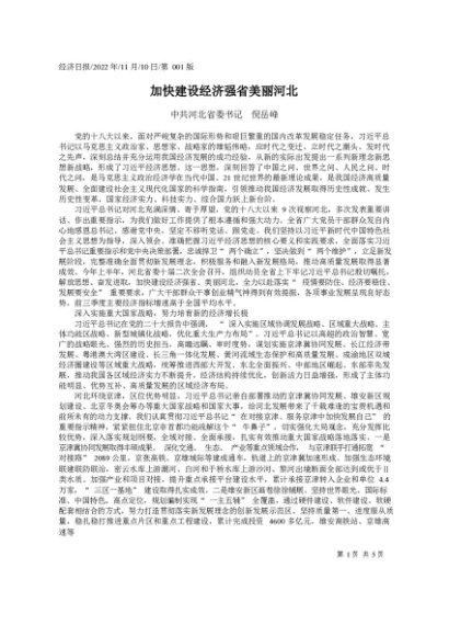 署名文章:2022.11.10中共河北省委书记倪岳峰:加快建设经济强省美丽河北