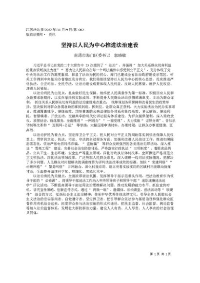 署名文章:2022.11.09南通市海门区委书记郭晓敏:坚持以人民为中心推进法治建设