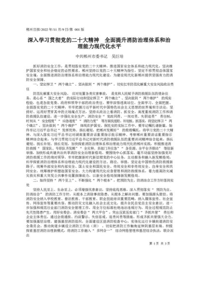 署名文章:2022.11.09中共郴州市委书记吴巨培:深入学习贯彻党的二十大精神全面提升消防治理体系和治理能力现代化水平