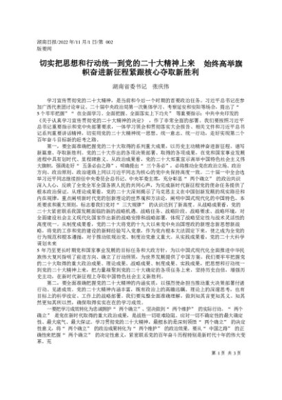 署名文章:2022.11.01湖南省委书记张庆伟:切实把思想和行动统一到党的二十大精神上来始终高举旗帜奋进新征程紧跟核心夺取新胜利