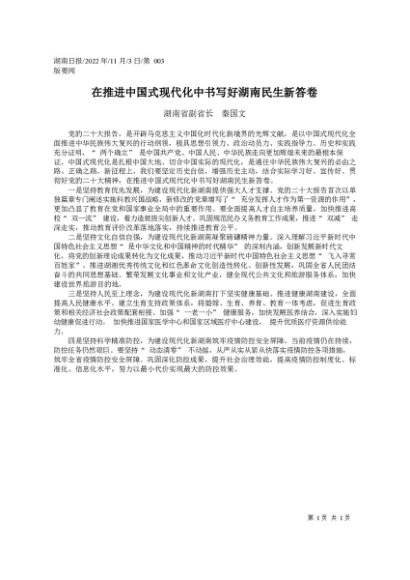 / 署名文章:2022.11.03湖南省副省长秦国文:在推进中国式现代化中书写好湖南民生新答卷