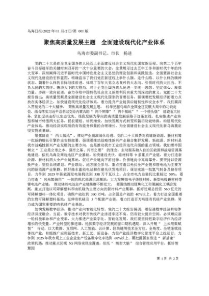 / 署名文章:2022.11.02乌海市委副书记、市长杨进:聚焦高质量发展主题全面建设现代化产业体系