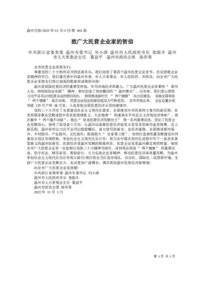 / 署名文章:2022.11.01温州市:致广大民营企业家的贺信