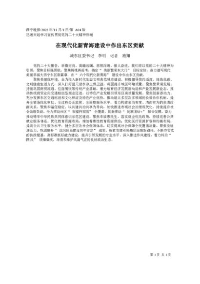 / 署名文章:2022.11.01城东区委书记李明记者施翔:在现代化新青海建设中作出东区贡献