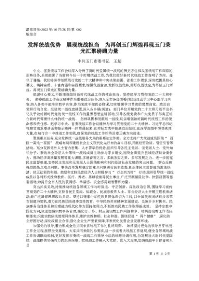署名文章:2022.10.28中共玉门市委书记王超:发挥统战优势展现统战担当为再创玉门辉煌再现玉门荣光汇聚磅礴力量