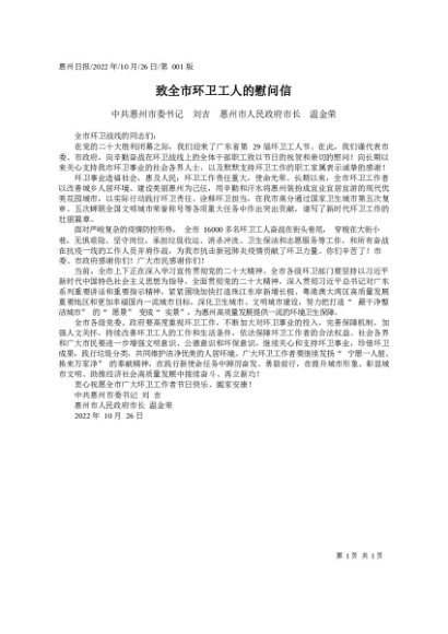/ 署名文章:2022.10.26中共惠州市委书记刘吉惠州市人民政府市长温金荣:致全市环卫工人的慰问信