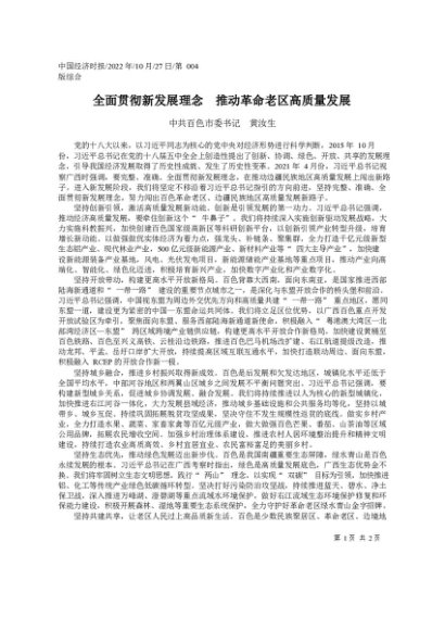 / 署名文章:2022.10.27中共百色市委书记黄汝生:全面贯彻新发展理念推动革命老区高质量发展
