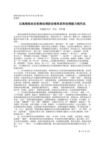 / 署名文章:2022.10.16市委副书记市长华学健:以高度政治自觉推动消防治理体系和治理能力现代化