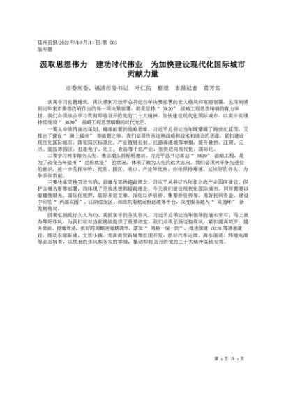署名文章:2022.10.11市委常委、福清市委书记叶仁佑本报记者黄芳宾:汲取思想伟力建功时代伟业为加快建设现代化国际城市贡献力量