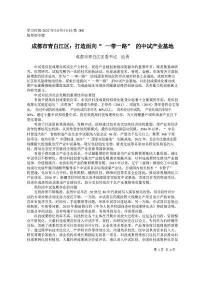 署名文章:2022.10.14成都市青白江区委书记池勇:成都市青白江区:打造面向一带一路的中试产业基地