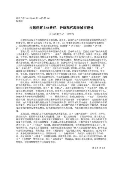 署名文章:2022.10.10舟山市委书记何中伟:扛起巡察主体责任,护航现代海洋城市建设