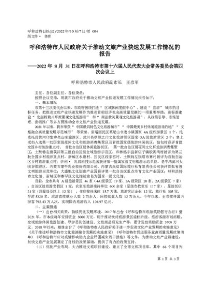 / 署名文章:2022.10.07呼和浩特市人民政府副市长王彦军:呼和浩特市人民政府关于推动文旅产业快速发展工作情况的报告