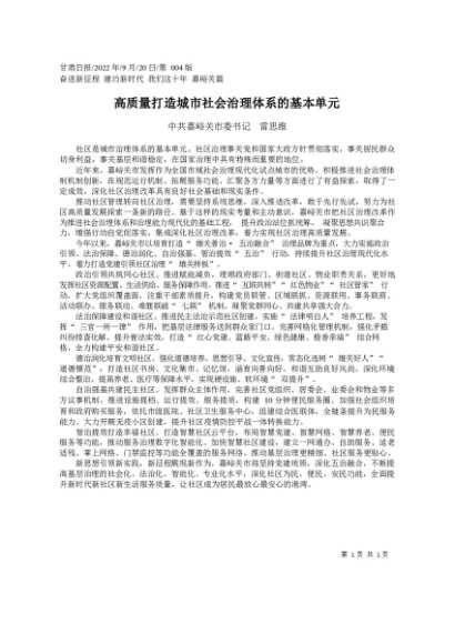 署名文章:2022.09.20中共嘉峪关市委书记雷思维:高质量打造城市社会治理体系的基本单元