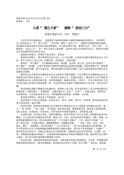署名文章:2022.09.27常德市委副书记、市长周振宇:心系国之大者提高政治三力