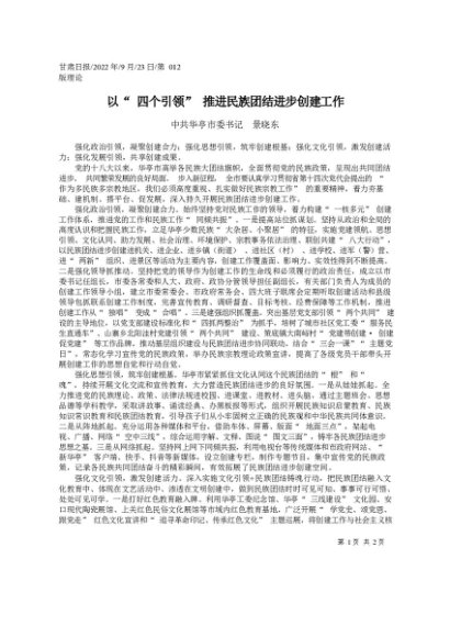 署名文章:2022.09.23中共华亭市委书记景晓东:以四个引领推进民族团结进步创建工作
