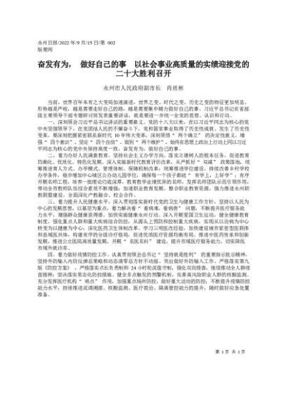 署名文章:2022.09.15永州市人民政府副市长肖质彬:奋发有为,做好自己的事以社会事业高质量的实绩迎接党的二十大胜利召开