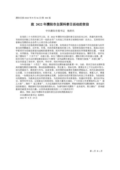 / 署名文章:2022.09.16中共濮阳市委书记杨青玖:致2022年濮阳市全国科普日活动的贺信