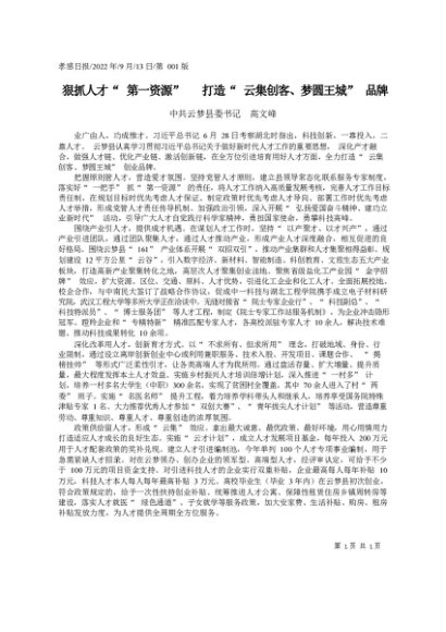 / 署名文章:2022.09.13中共云梦县委书记高文峰:狠抓人才第一资源打造云集创客、梦圆王城品牌