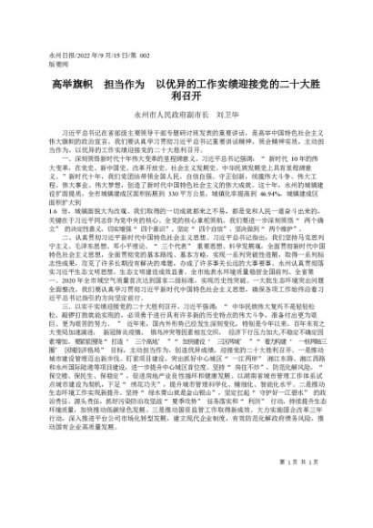 署名文章:2022.09.15永州市人民政府副市长刘卫华:高举旗帜担当作为以优异的工作实绩迎接党的二十大胜利召开