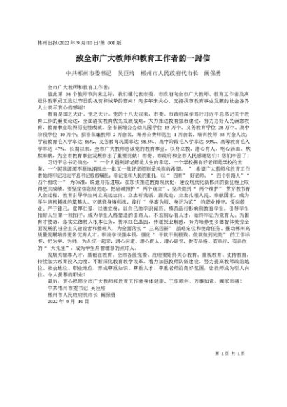 署名文章:2022.09.10中共郴州市委书记吴巨培郴州市人民政府代市长阚保勇:致全市广大教师和教育工作者的一封信