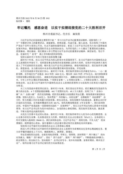 署名文章:2022.08.30郴州市委副书记、代市长阚保勇:牢记嘱托感恩奋进以实干实绩迎接党的二十大胜利召开