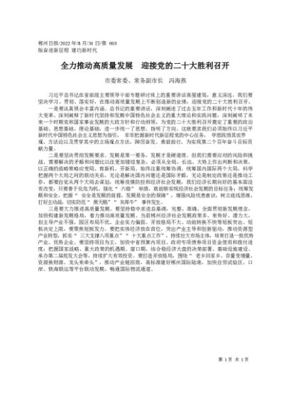 / 署名文章:2022.08.31市委常委、常务副市长冯海燕:全力推动高质量发展迎接党的二十大胜利召开