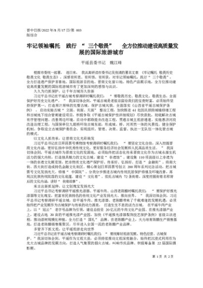 署名文章:2022.08.17平遥县委书记魏江峰:牢记领袖嘱托践行三个敬畏全方位推动建设高质量发展的国际旅游城市