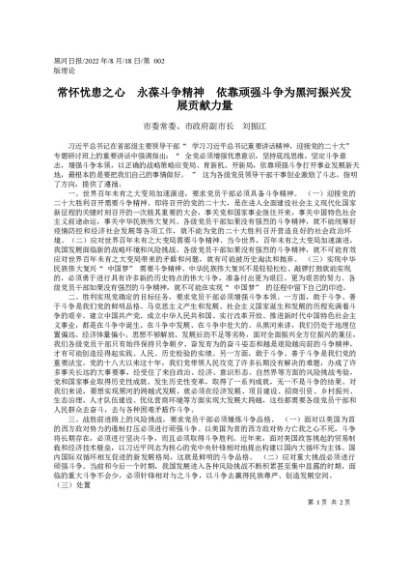 / 署名文章:2022.08.18市委常委、市政府副市长刘振江:常怀忧患之心永葆斗争精神依靠顽强斗争为黑河振兴发展贡献力量