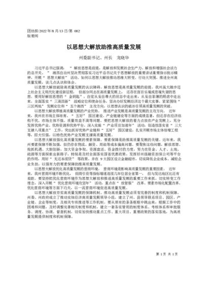 / 署名文章:2022.08.13州委副书记、州长龙晓华:以思想大解放助推高质量发展