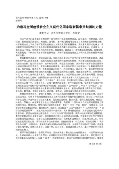 / 署名文章:2022.08.12市委书记市人大常委会主任李锡文:为谱写全面建设社会主义现代化国家崭新篇章贡献黑河力量