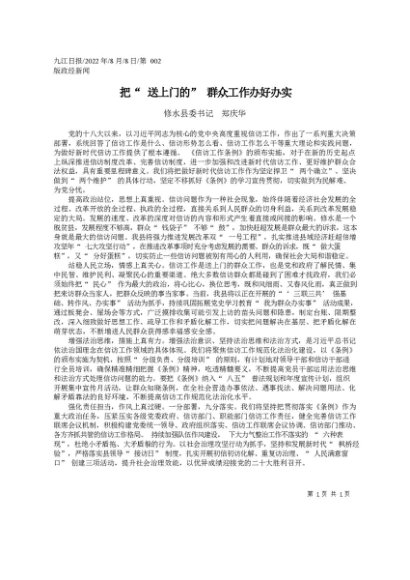 / 署名文章:2022.08.08修水县委书记郑庆华:把送上门的群众工作办好办实