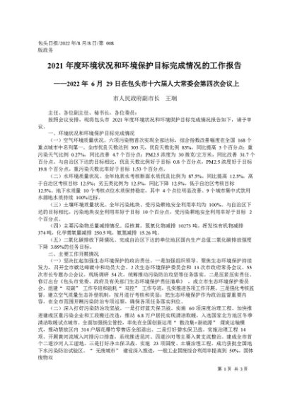 / 署名文章:2022.08.08市人民政府副市长王瑞:2021年度环境状况和环境保护目标完成情况的工作报告