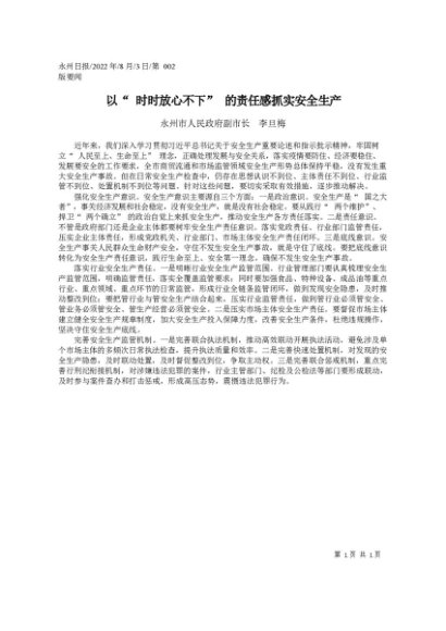 署名文章:2022.08.03永州市人民政府副市长李旦梅:以时时放心不下的责任感抓实安全生产