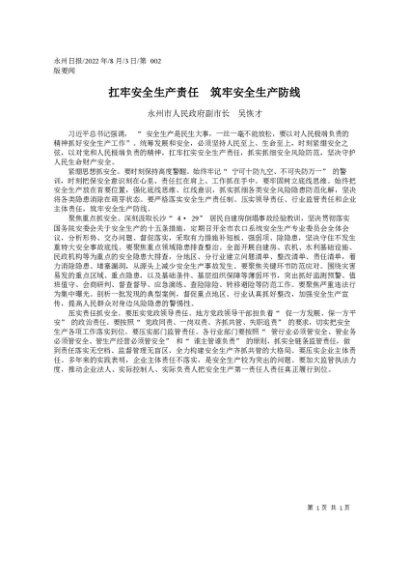 署名文章:2022.08.03永州市人民政府副市长吴恢才:扛牢安全生产责任筑牢安全生产防线
