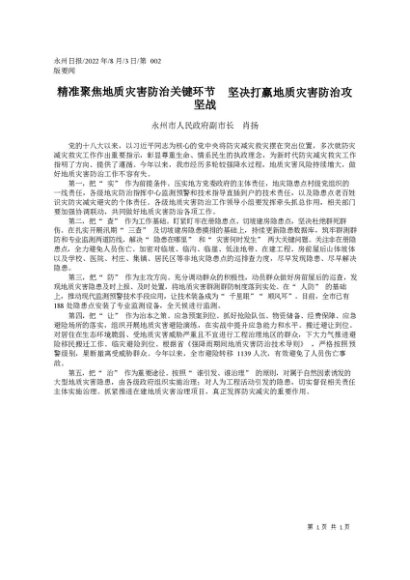 署名文章:2022.08.03永州市人民政府副市长肖扬:精准聚焦地质灾害防治关键环节坚决打赢地质灾害防治攻坚战