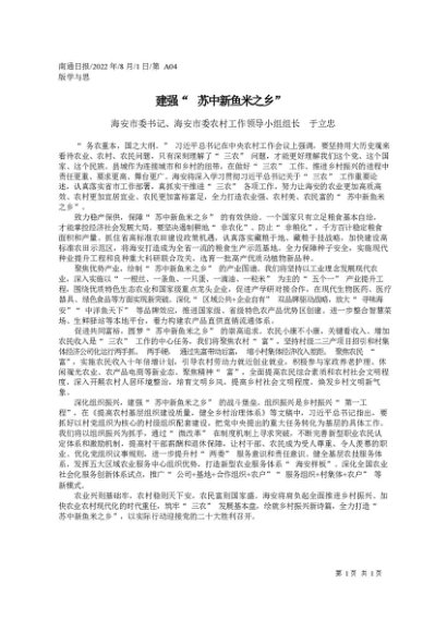 / 署名文章:2022.08.01海安市委书记、海安市委农村工作领导小组组长于立忠:建强苏中新鱼米之乡
