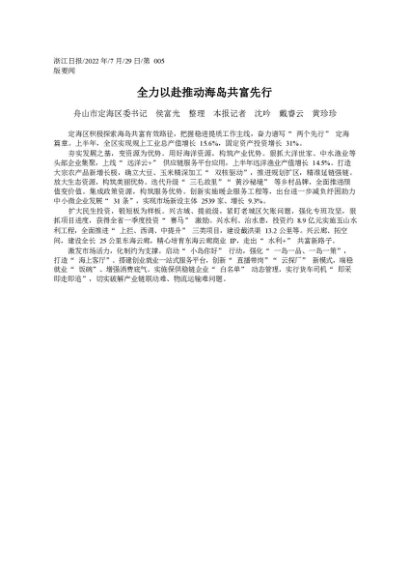 / 署名文章:2022.07.29舟山市定海区委书记侯富光本报记者沈吟戴睿云黄珍珍:全力以赴推动海岛共富先行