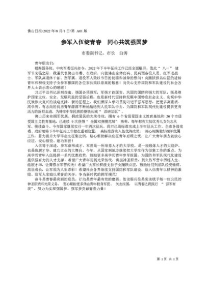 / 署名文章:2022.08.01市委副书记、市长白涛:参军入伍绽青春同心共筑强国梦
