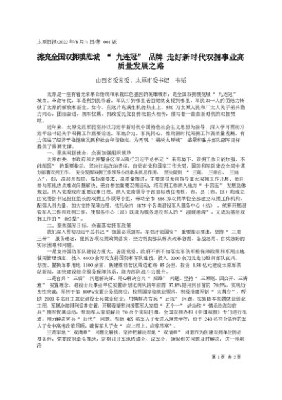 署名文章:2022.08.01山西省委常委、太原市委书记韦韬:擦亮全国双拥模范城九连冠品牌走好新时代双拥事业高质量发展之路