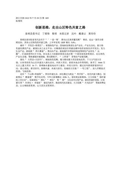 / 署名文章:2022.07.29泰顺县委书记丁熠锋本报记者沈吟戴睿云黄珍珍:创新思维,走出山区特色共富之路