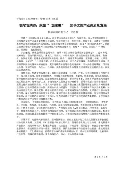 / 署名文章:2022.07.21额尔古纳市委书记文进磊:额尔古纳市:跑出加速度加快文旅产业高质量发展
